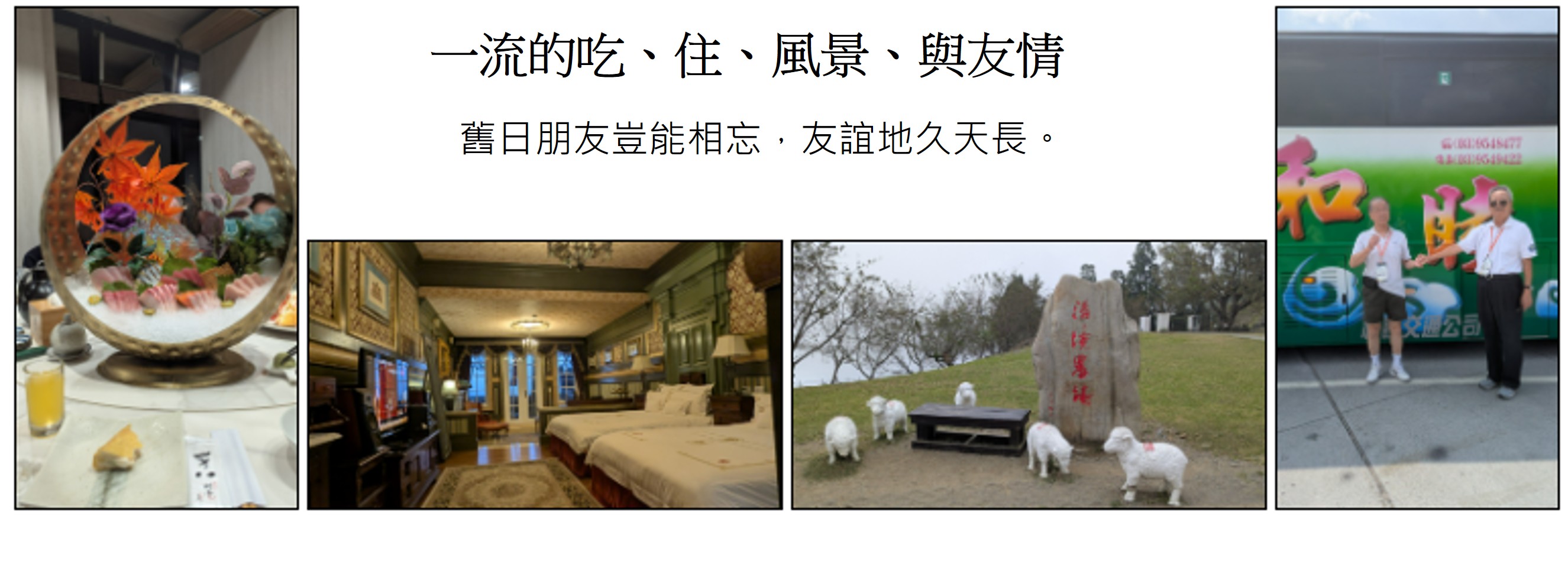 遊遊通派出三四名年輕小伙子,全程對我們這群老人,悉心照顧、體貼入微呵護 ,感謝良深,深信找對人,但也仍被打油詩譏為:「起得比雞早、跑得比馬快、吃得比貓好、比豬多,累得比狗喘、但也是楽得比神仙爽、愛得比鴛鴦深、活得比川普好」。 還好這次不像前次同學會,有人在車上叫不醒,導遊叫救護車,三分鐘就到了,展現台灣醫療的可愛可貴,後來發現証實中文名言也很可愛,是英文沒有的。「裝睡的人是叫不醒的」,只是會虛驚一場。