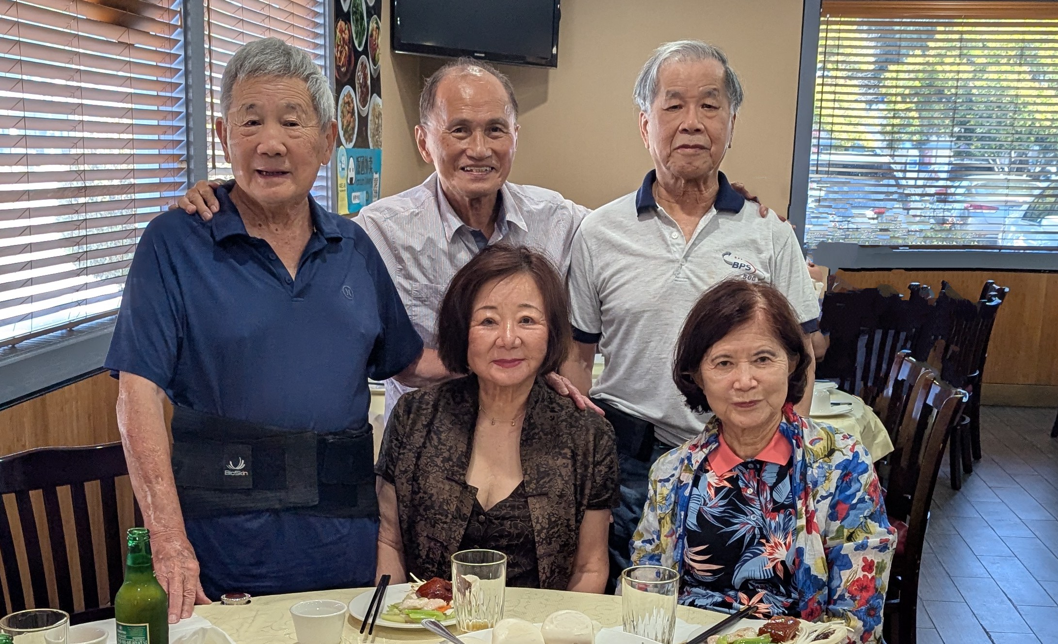 2025年5月3日週六11:30am,有朋自遠方來(Union City)不亦樂乎!李世偉從東方(Modesto)請 Elon Musk 開車、車上睡了2個小時; 蕭正男從東北方(Walnut Creek)開車45分鐘;賴昭正從南方(San Jose)開車45分鐘;高政治從西邊(Brisbane)開車約半小時;吳春霖從西南方(Los Gatos)開車約1小時;洪惠光從東北方(Sacramento)坐火車、然後轉「灣區捷運」,以便欣賞加州的美景,結果遲到了2個小時,來不及吃飯便開始大罵「灣區捷運」(如果不是劉舞侯幫他留菜,他可能真的只是趕來洗碗而已);劉舞侯算是當地人(San Leandro,捷運一站)。酒逢知己千杯少,一直聊到餐廳打烊(2:30),洪惠光趕不上他原定的火車。還好半路殺出個程咬金,蕭正男捷運他到加州火車的一個中間站,讓他趕上原來預訂的班次,避免了回家跪算盤的命運。下面是此次加州灣區小聚會的留影。立者左至右:劉舞侯、高政治、賴昭正、李世偉、蕭正男、洪惠光;坐者左至右:林淑慎(高夫人)、張澄子(蕭夫人)、米天寶(賴夫人)、方治鳳(吳夫人)、吳春霖。